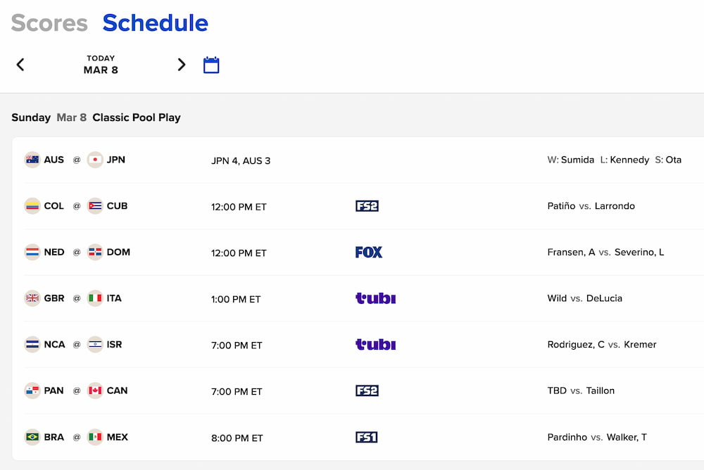 現在開催中のWBCの対戦表をMLB.comで見てみると、“vs.” でも “v.” でもない「@」が使われていますが、この「@」も対戦カードを表す時に使われます。